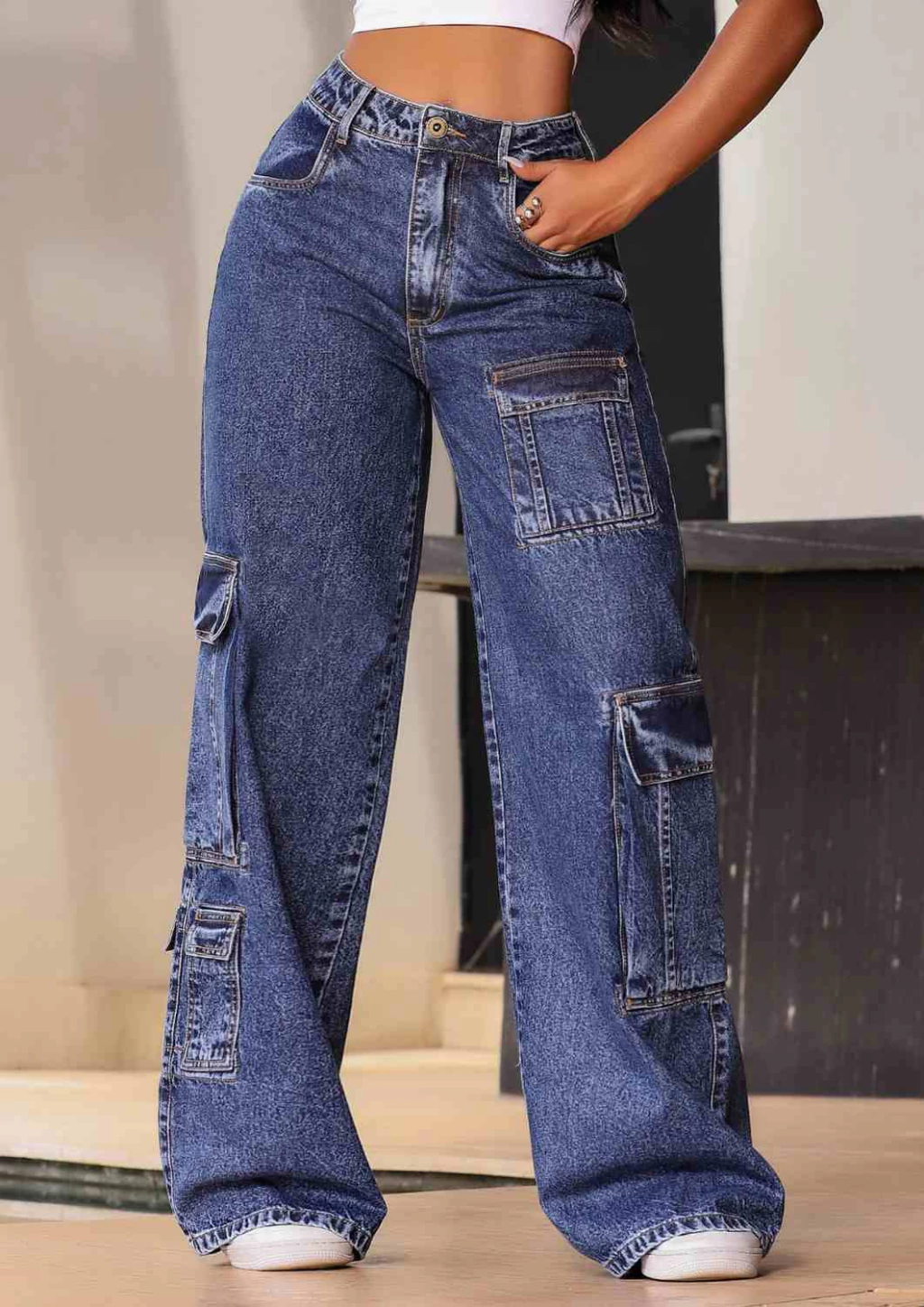 A Calça Cargo Jeans une o visual urbano com a praticidade que o dia a dia exige. Confeccionada em jeans resistente e confortável, ela possui bolsos utilitários nas laterais que adicionam um toque funcional e moderno ao look. Com modelagem reta (ou slim, caso queira especificar), cintura média e acabamento em costura reforçada, é perfeita para compor desde produções casuais até as mais estilosas.